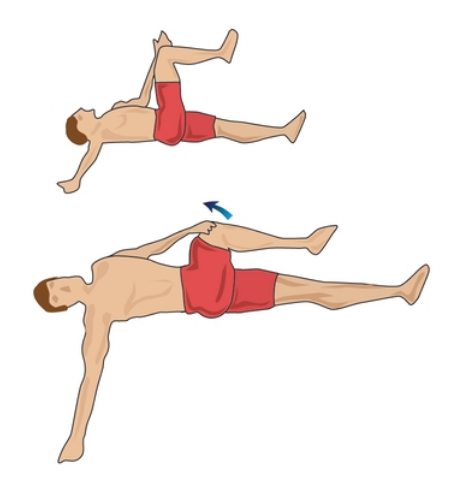 누워서 혹은 앉아서 하는 스트레칭으로, 양쪽 무릎을 굽히고 왼쪽 다리를 오른쪽 무릎 위에 올리고 양손으로 오른쪽 무릎을 잡고 가슴 쪽으로 당겨줍니다. 이로써 고관절 내 이상근을 늘려주는 효과를 얻을 수 있습니다.